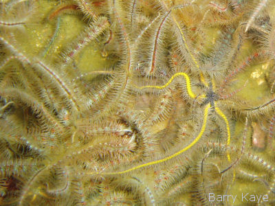 In the afternoon we drifted with the flood tide into the inner basin of Loch Creran – being at springs, there was with strong current. Or at least it was after we found it! – We’d taken a direct bearing to the bridge, and so ended up too close to the North side of the channel to get into the main current until we were pretty much under the bridge itself. Our route did take us through a deep basin immediately North West of the bridge, however (see charts). This contains an extensive brittle-star bed, which looks rather grey and unappealing at any distance, but go in close, and the grey hairyness resolves into myriads of brightly coloured brittle-stars (see photo). These are interspersed with the occasional giant starfish (typically 0.5m from arm-tip to arm-tip).